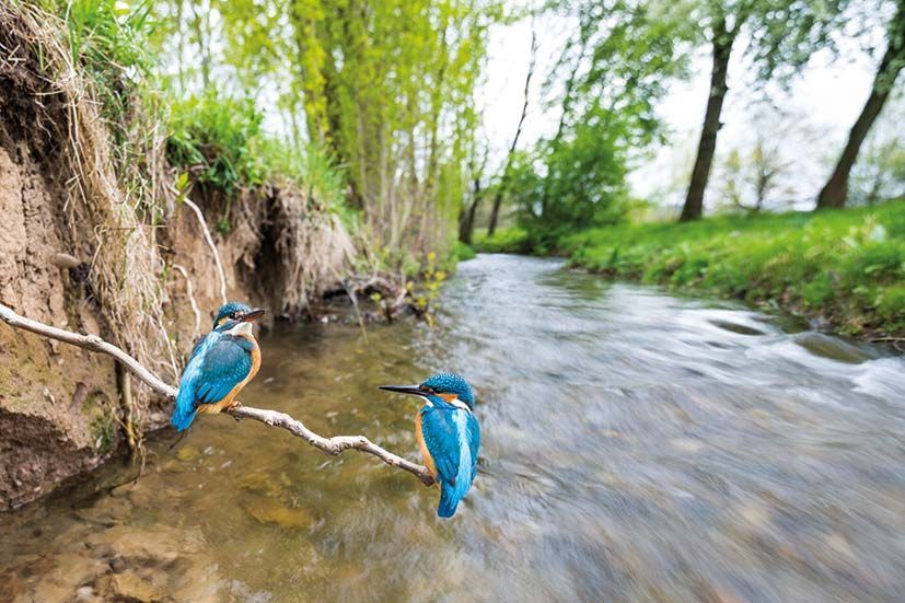 Ein Weibchen (links) und Männchen im typischen Lebensraum: beutereiche Fliessgewässer, die auch ruhige Abschnitte zur Jagd und Steilwände zur Brut aufweisen. Foto: Ralph Martin